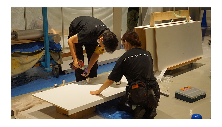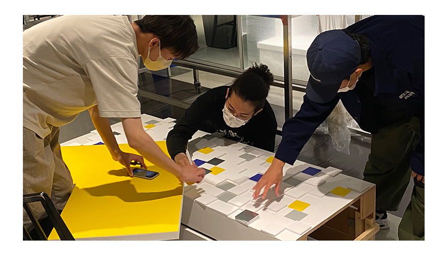 中央の「K」ロゴは、学生がアイディア出しからデザイン、制作までを担当。学生たちは、博展の制作スタジオでの作業にも参加し、プロの現場を体感する機会になりました。プロジェクトに参加したWA-K.pro代表の依本 晃希さんは、「設計から施工、完成までのすべての過程に関わることができる貴重な場。展示のコンセプトがどうやったら伝わるか工夫する過程に建築分野と同じ面白さを感じ、勉強になりました。」とコメントしました。