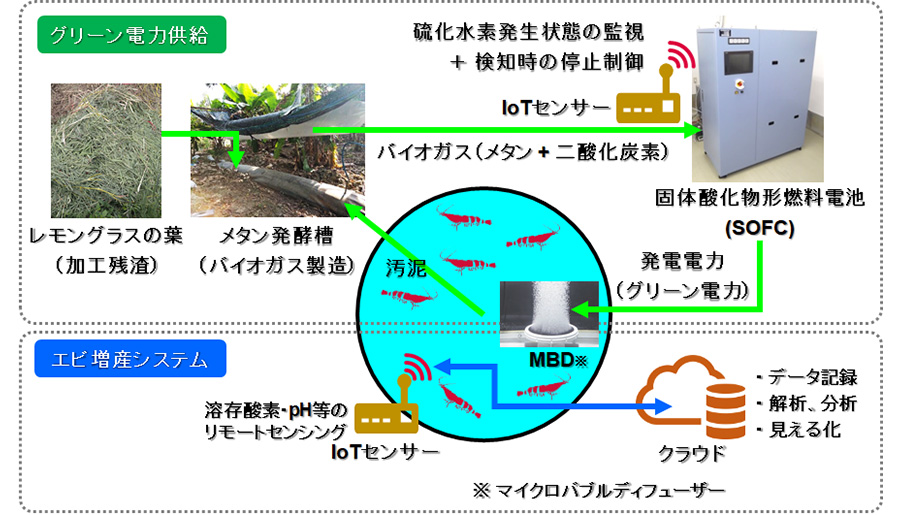 一方のエビ増産システムでは、IoTを活用して養殖池の水質や養殖関連機器の常時監視・調整を行うとともに、微細な気泡で溶存酸素濃度を高めるマイクロバブルディフューザーを導入することで、エビの生存率・成長率を引き上げ、養殖生産量の最大化を図ります。IoTは、SOFCの運転管理にも活用されます。