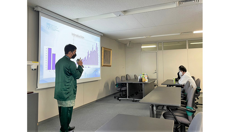 最終日の発表会では、本学の指導役学生とマレーシア国民大学の学生が2グループに分かれて「生体材料の材料定数決定するための感度解析」と「生体材料の力学解析を効率化するサロゲートモデルの開発」という研究課題で発表を行いました。