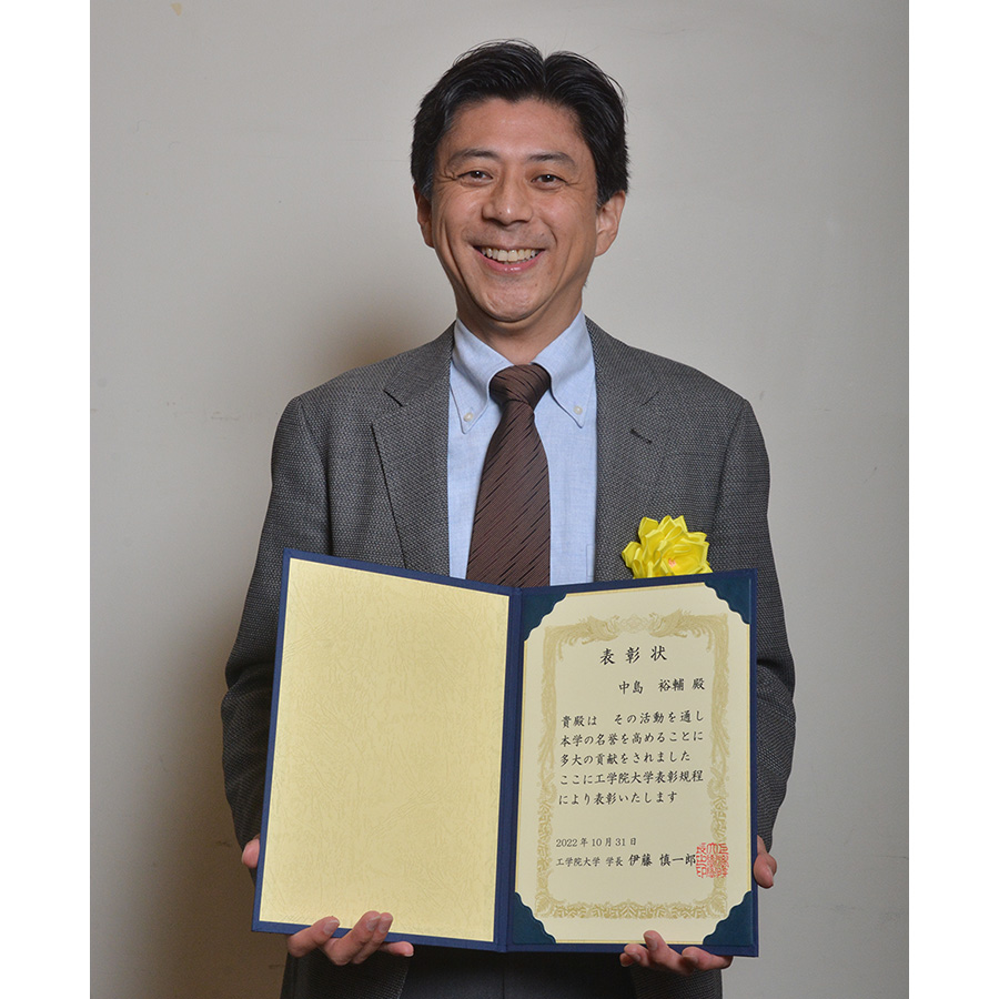 10月31日に開催された学園創立135周年記念表彰において、2022年度「工学院大学ベストティーチャー」として賞状と記念品を授与しました。
