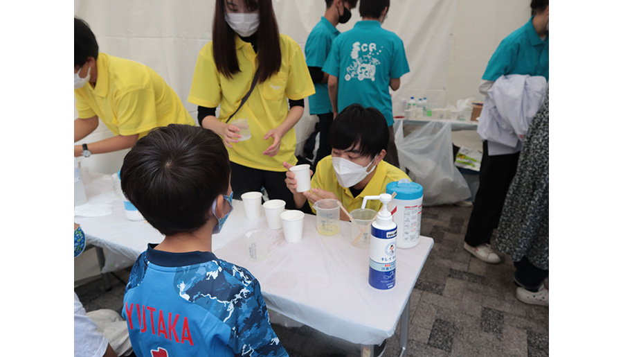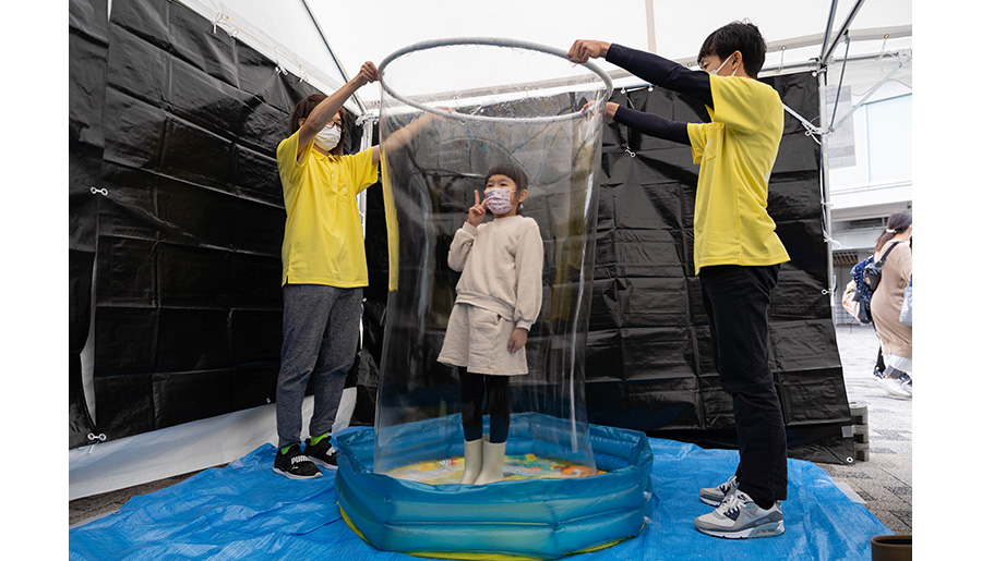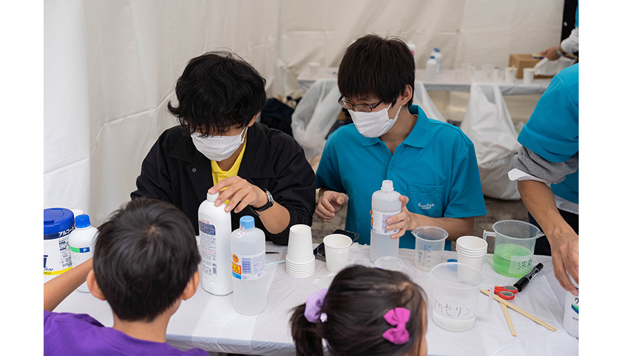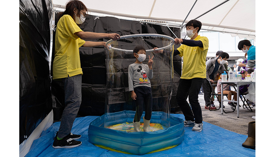 SCPは、参加者が巨大なシャボン玉の中に入ることができる体験ブースを出展し、地域の子どもたちが多く来場しました。このシャボン玉は成分を工夫することで、割れにくく、人が入れるサイズまで大きくすることができています。体験してくれた子どもたちに、シャボン玉の仕組みや表面張力について説明し、楽しみながら科学に興味を持ってもらう機会になりました。