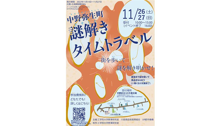建築学部まちづくり学科 野澤研究室は、11/26(土)・27(日)、東京都中野区弥生町にある川島商店街を中心とした「中野弥生町 謎解きタイムトラベル」を開催いたします。