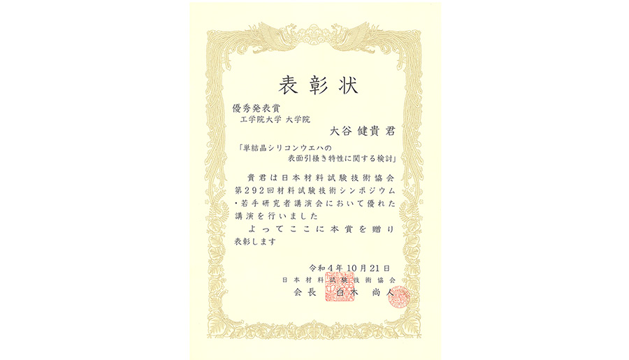 その結果、日本材料試験技術協会の理事会理事メンバーおよびシンポジウム審査員による厳正なる審査にて、発表および研究内容が最も優秀であると認められ、日本材料試験技術協会より大谷さんに「日本材料試験技術協会」優秀発表賞が授与されました。