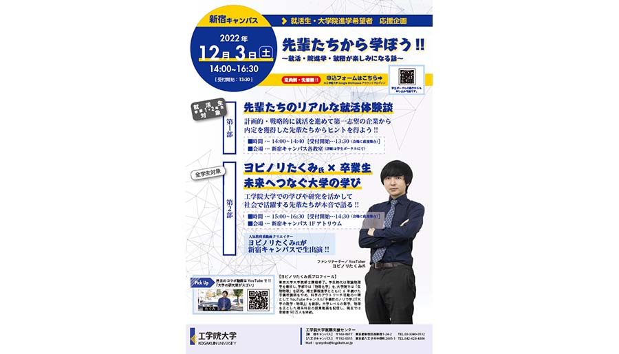 | プログラム・内容 | 第1部 先輩たちのリアルな就活体験談[新宿キャンパス各教室] 計画的・戦略的に就活を進めて第一志望の企業から内定を獲得した先輩たちから、ヒントを得よう! 第2部 ヨビノリたくみ氏×卒業生 未来へつなぐ大学の学び[新宿アトリウム] 工学院大学での学びや研究を活かして社会で活躍する先輩たちが本音で語る!  |