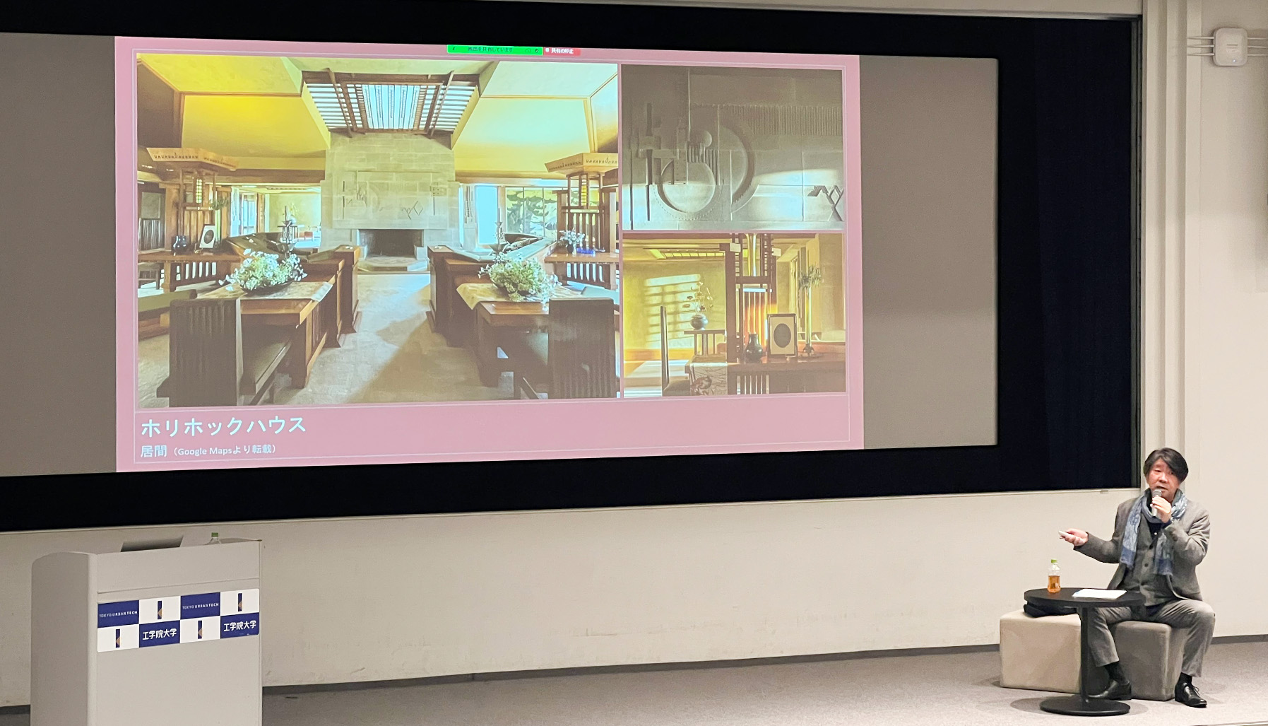 2022年度は、建築家の遠藤現氏が登壇し、20世紀を代表するアメリカの建築家、フランク・ロイド・ライト(1867-1959)について講演しました。当日は、鈴木敏彦教授(建築デザイン学科)が司会を務めました。