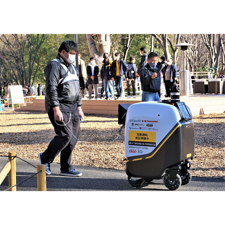 自動配達実験で、荷物を載せたマシン(手間)の到着を待つ学生達(奥)