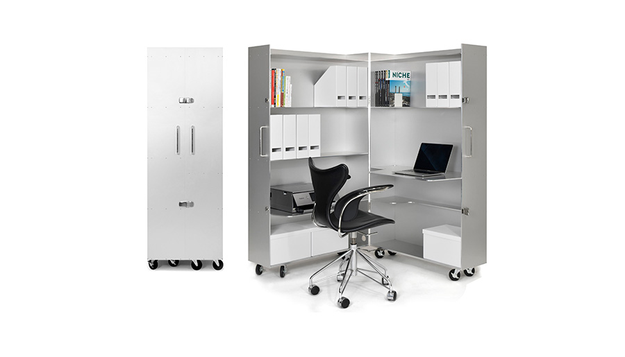 スーツケースのようにキャスターを転がし、好きな場所で開いて椅子を持ち込めば、プライベートな書斎が完成します。デスクと棚にPCや本やプリンターを広げて集中した時間を過ごした後は、さっと閉じれば空間がすっきりと片付きます。アルミハニカムパネル製のニュートラルな質感が、新しい環境の演出を可能にします。