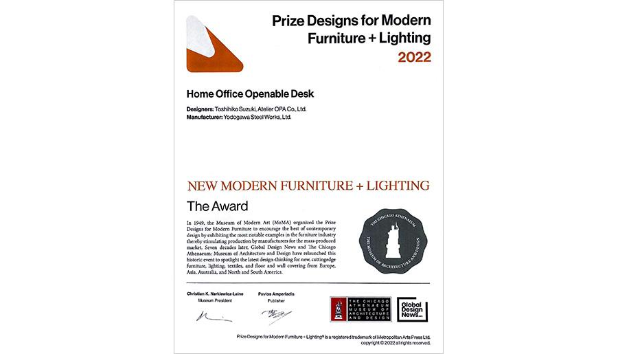 2022年、グローバル・デザイン・ニュースとシカゴ・アテネウム・建築デザイン博物館がこの歴史的なコンテストを72年ぶりに再開しました。デザイン、技術革新、快適性、材料、持続可能性に優れ、将来のデザイン開発に影響を与える家具と照明を募集し、24か国からの家具38作品と照明20作品がショートリストに選ばれました。最終選考にて、HOME OFFICEは「ベスト・オフィス・オブ・ザ・イヤー2022」を受賞しました。