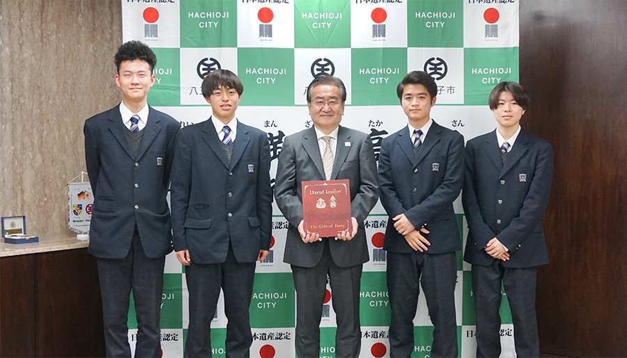 2023年1月17日、高校インターナショナルコースの1年生4名が、中野由章校長、中川千穂教諭と共に石森孝志 八王子市長に面会し、ルーマニア訪問について報告しました。ルーマニアでの学びを活かし、若者による八王子市の文化保全に向けて意気込みを伝えました。