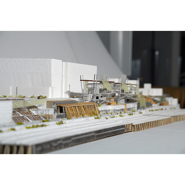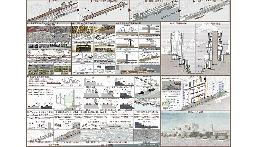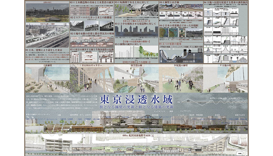 馬場さんの作品は「建築・土木が目に見える上層部しか考えられていない」という現状への違和感に対し、目に見えなくなった大地・土中についての調査を行い、それを積極的に改善するための設計提案です。山手線の既存線路に新しい浸透水域という役割を見いだし、大地に蓋をしている擁壁・建築を更新することで、土木の寿命・大地への荒廃した関係・緑地の減少など土木の転換期である現在に、新しい風景を創り出すという提案です。