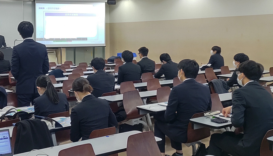 今年度は初めて、企業の方と直接お話しができる対面と、どこにいても気軽に参加できるオンラインを組み合わせたハイブリッド形式で実施。本学の学生を積極的に採用したい、業界を代表する150社のリクルーター・卒業生・採用担当者が登壇しました。学生からは、「採用担当の方と対面で話すことができて、志望職種に関する悩みを相談するなど貴重な機会となった」、「今まで視界になかったような新しい企業に出会うことができた」、「卒業生の方からも業務内容について説明いただき、学んでいることがどのように仕事に繋がるのか具体的にイメージすることができた」などの声がありました。