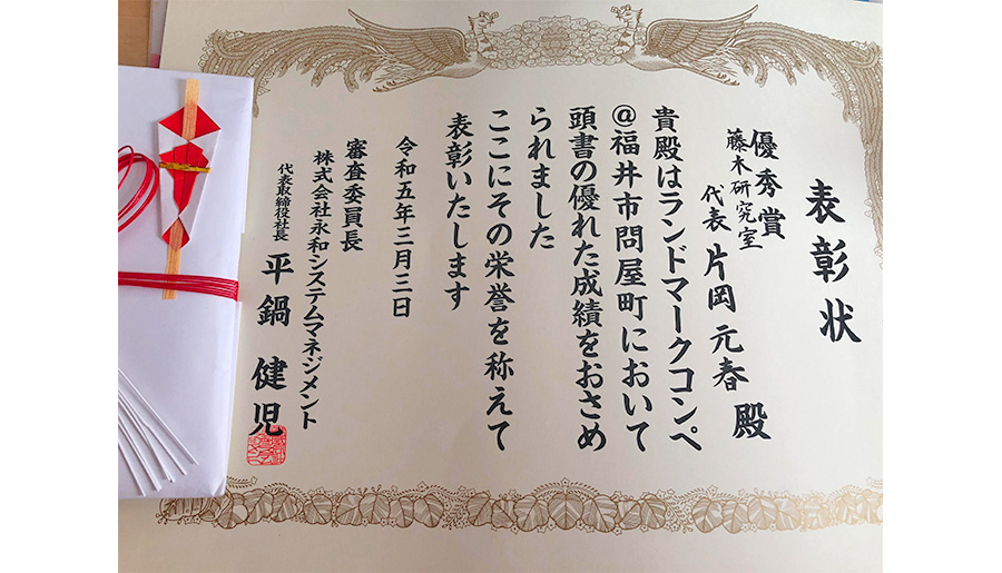 藤木研究室(建築デザイン学科)の3年生が主体となり応募した作品が、「ランドマークコンペ@福井市問屋町」で優秀賞を受賞しました。