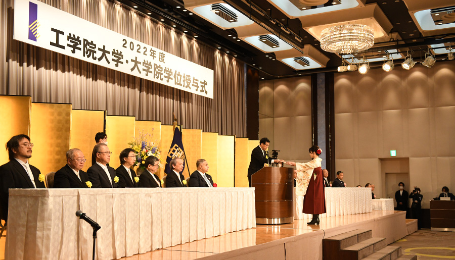 3月20日、京王プラザホテルコンコードボールルームを会場に工学院大学・大学院の学位授与式が挙行されました。2022年度は、学部生1259名、修士・博士課程298名に学位記が授与されました。