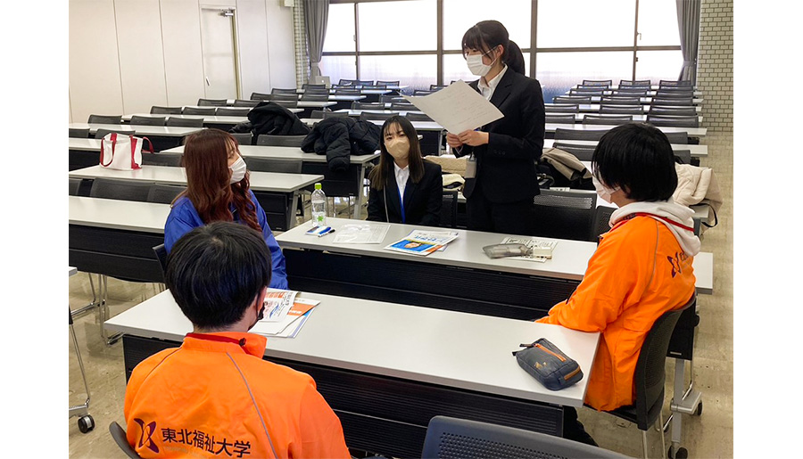 防災イベント後は、東北福祉大学で行われた学生交流会に参加しました。尚絅学院大学(名取市)の学生も交えて、「大学生はチームとしてどの様な内容ができるだろう?」をテーマにグループワークを進めました。「自分たちが行動する強みとは?」「学生がまとまることで得られる効果・影響は?」など活発に議論することで、防災から離れた視点に立ってこれまでの実績を振り返り、活動継続を後押しする機会となりました。
