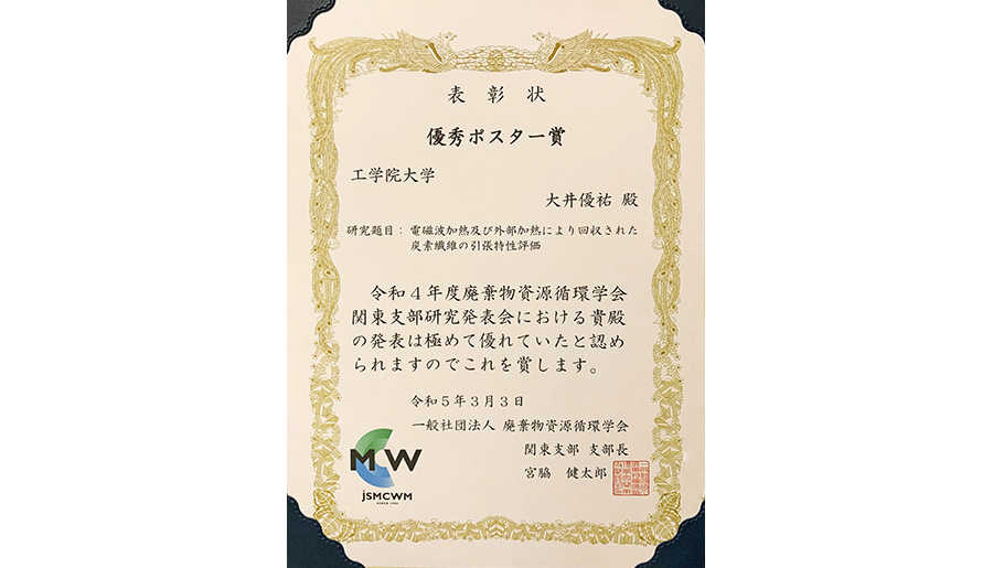 3月3日(金)に開催された令和4年度廃棄物資源循環学会関東支部講演会・研究発表会において、工学部機械工学科 4年生の大井優祐さん(リサイクル工学研究室・小林潤教授)が優秀ポスター賞を受賞しました。