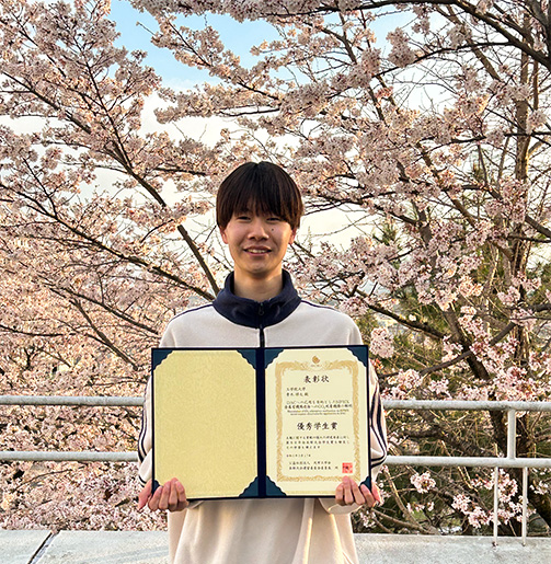 この度は優秀学生賞をいただき、誠に光栄に思います。このような賞をいただけたのも日頃より熱心に指導してくださった高羽先生・宮川先生をはじめとする研究室の皆様のおかげです。この経験を励みに社会に出てもより一層精進して参りたいと思います。