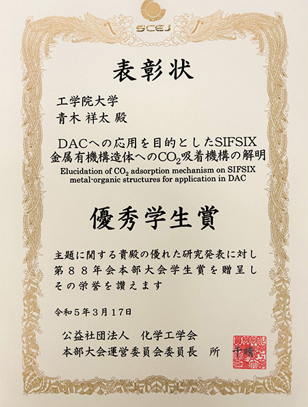 3月15日~17日に東京農工大学で開催された化学工学会第88年会において、先進工学部環境化学科4年(受賞当時)の青木祥太さん(環境計算化学工学研究室/高羽洋充教授・宮川雅矢助教)が優秀学生賞を受賞しました。