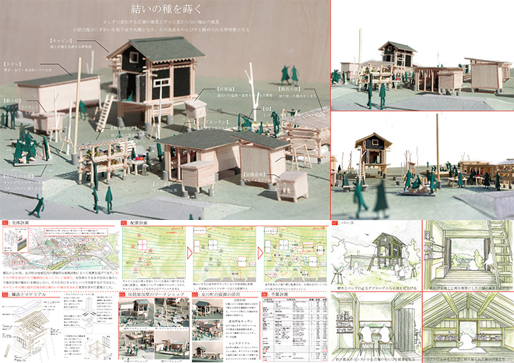 1月13日に開催された女川町海岸広場プライベートキャビンデザインコンペ(主催:女川みらい創造株式会社)にて、建築学部建築デザイン学科 4年宮本皓生さん、同4年住田亮真さん(冨永研究室 冨永祥子教授)、同4年竹下音さん、同4年吉規朝香さん(伊藤研究室 伊藤 博之 教授)、修了生の松山幸太さんたちの作品「結いの種を蒔く」が審査員賞(相澤賞)を受賞しました。