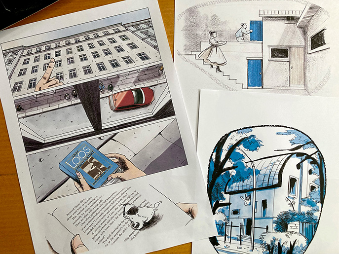 ロースは著名な近代建築家ですが、現存する関連資料が少なく、また実際に拝見できる建築作品も限られていることから、日本では「有名だがどう理解していいかわからない建築家」という立ち位置にあります。そのロースの作品を理解するためには、彼のキャラクターや当時の時代背景、施主や友人らとの交友関係など、さまざまな要素を丸ごと表現できる「漫画」がふさわしいと考え、冨永教授はサバティカル期間中に現地取材し、現在漫画制作を進行中です。
