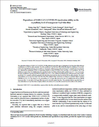 電気・電子工学専攻 修士2年の熊谷杏子さん(永井裕己研究室)が参加した星和電機株式会社、大阪大学、大阪公立大学との共同研究成果"Dependence of SARS-CoV-2 (COVID-19) inactivation ability on the crystallinity level of transparent Cu2O thin films "が、国際学術雑誌World Scientific PublishingのFunctional Materials Lettersにオンラインで掲載されました。