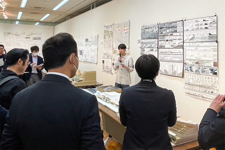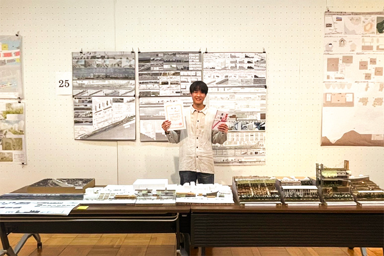 各大学を代表する作品、先生方集まるなかで、この賞を頂けたことたいへん嬉しく思います。審査員をはじめ多くの方と意見交換ができたことはとても貴重な経験になりました。沿線上に広がる風景が想像でき良かったとコメントを頂き、これからも社会問題に対して様々な視点から解決方法を考え、今にはない風景を作り出していきたいです。ご指導頂いた冨永先生、卒制期間支えてくださった先輩、後輩に改めてお礼申し上げます。この経験を糧にこれからも精進していきたいと思います。