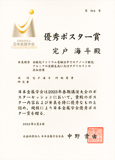 3月7日(火)に対面で開催された公益社団法人日本金属学会 2023年春期講演大会第40回ポスターセッションにおいて、先進工学部応用化学科 4年(受賞当時)の完戸海斗さん(無機表面化学研究室・阿相英孝教授)が優秀ポスター賞を受賞しました。