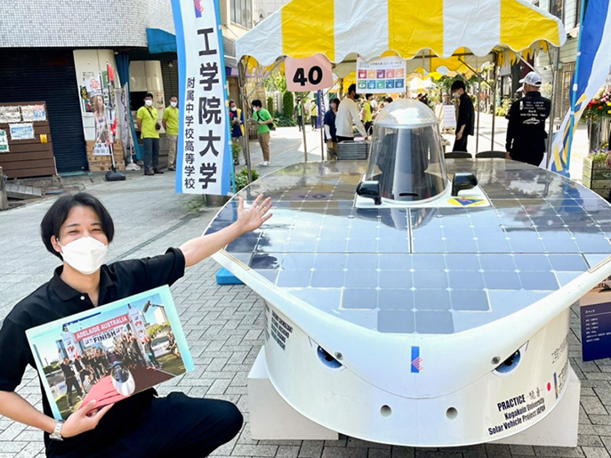 SCPは、例年、科学の楽しさを体験できるブースを出展し、親子連れに人気です。ソーラーカーの展示は、大学ソーラーチームから指導を受け、2021年以降ソーラーカーレースに参戦している自動車部の生徒が、車両を持ち込んで環境とソーラーカーについて説明します。
