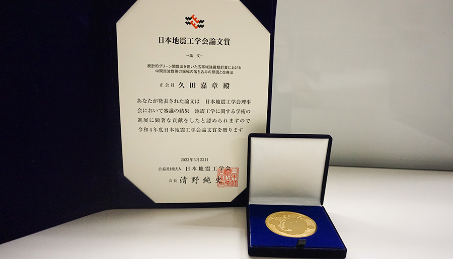 久田教授の論文「統計的グリーン関数法を用いた広帯域強震動計算における中間周波数帯の振幅の落ち込みの原因と改善法」では、従来行われた震動計算における課題について、原因を4つの要因に分類し改善法を提案しています。学術的な高い新規性・信頼性があり、地震動予測手法の発展に寄与することから、有用性•発展性がきわめて高いと評価されました。