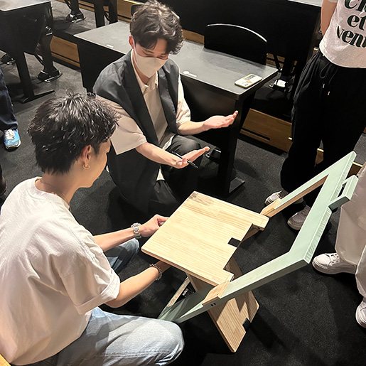 インテリア分野に着目した企画で、昨年度のテーマ『優しい照明』に続き、今年度は『座りたくなる椅子』をテーマに5/26から活動を開始しました。各班、予算10,000円以内で、椅子の設計から材料の買い出し、製作を自分たちで進め、完全オリジナルの椅子を作り上げました。