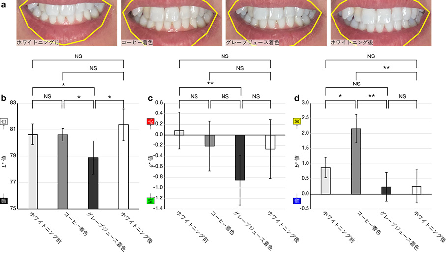 本研究グループは、歯の色の相対的な変化を評価するためのスマホカメラアプリを論文発表しました。アプリには環境光センサーと顔ランドマーク検出AI技術※が搭載されており、自撮りモードで前回撮影時と同じ明るさ、同じ口の開き方の画像を得ることができます。実験では、コーヒーやグレープジュースで歯に着色した後とジェルホワイトニング後にアプリで撮影を行いました(図1a)。画像中の歯の色を測定したところ、着色と漂白により相対的な色の変化を数値化できました(図1b-d)。 また、人の目では違いに気付きにくいとされる微妙な変化(色差1.3)も撮影画像から確認できることが示されました。作成したアプリに既存の画像解析技術を組み込むことで、歯の色をスマホ一台で高精度に評価できる可能性を示す実験結果です。