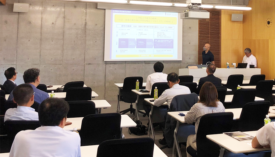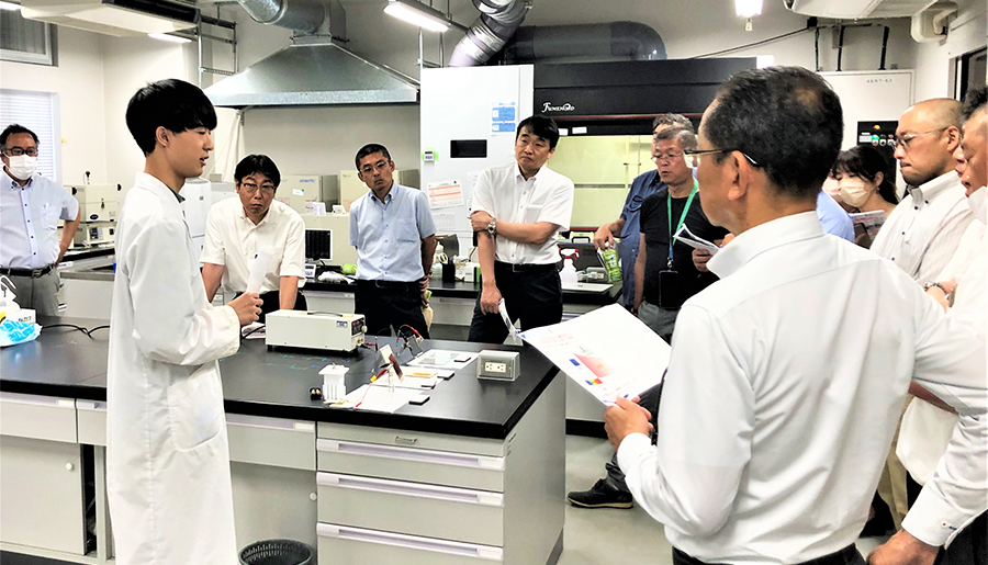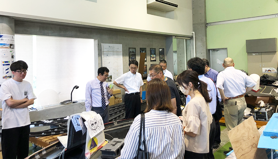 Home 2023年度のお知らせ 立川市内の企業が産学連携を目的に研究施設を見学(7/12) 立川市内の企業が、産学連携を目的に研究施設を見学(7/12) 2023/08/03 シェアする 立川商工会議所と同会員企業の方15名が、7月12日、八王子キャンパスの研究室や施設5か所を見学しました。 参加した企業は、金属加工や建築関係、磁気製品など10社です。同行した伊藤学長は、社会への技術移転を目的に、本学が技術指導や共同研究を歓迎していることを紹介しました。 本学は、創立以来、135年以上にわたってモノづくりに関わる人材を育成し続けていることを紹介。次に見学した ものづくり支援センターでは、企業参加者は設備機器にさっそく関心を示されました 三木良雄教授(情報科学科)による経営情報システムの研究内容説明。経営に直結する内容で、各企業参加者は熱心に聴講。 田中久弥教授(情報デザイン学科)による研究説明。3次元の動きを計測する技術に関心高く、多くの方が撮影 酸化物エレクトロニクス研究室(応用物理学科)。永井裕己 准教授による研究室説明に続き、学生が自身の研究を発表。次に訪れた電気環境化学研究室(環境化学科)でも学生が説明。 都市防災センター(建築学科)では、建築関係の企業様が特に興味深げに視察。 学生がデザインから手掛けたソーラーカーを見学。大学との連携方法の一つに、学生活動への協力があることを紹介。 研究・産学連携 前へ 一覧に戻る 次へ