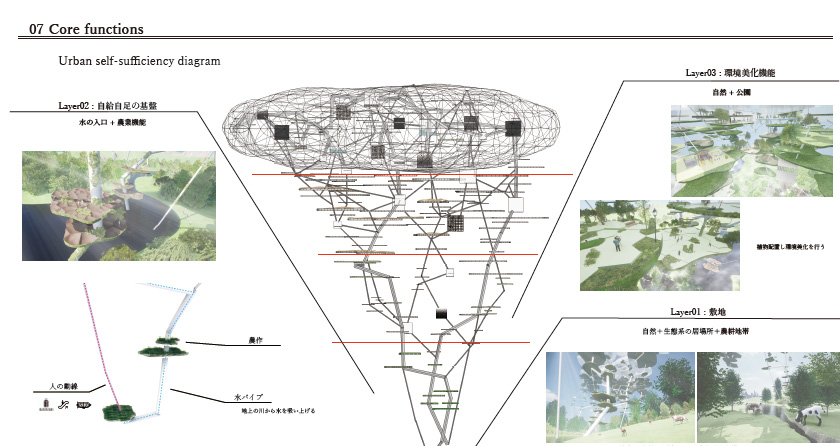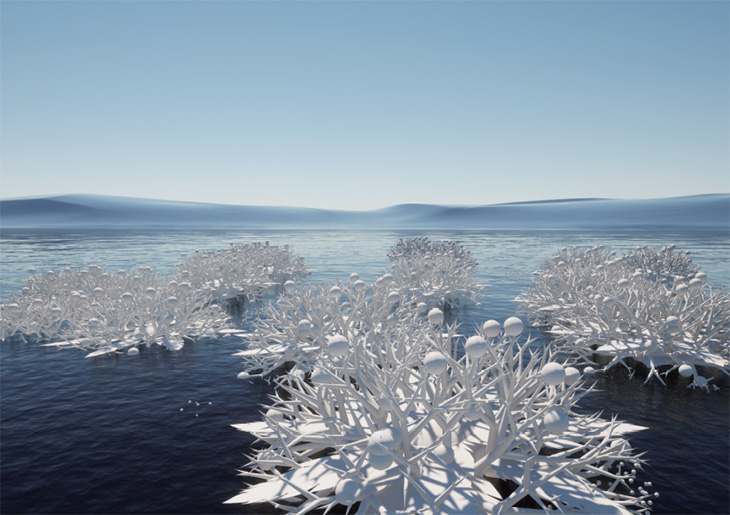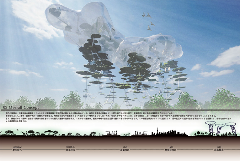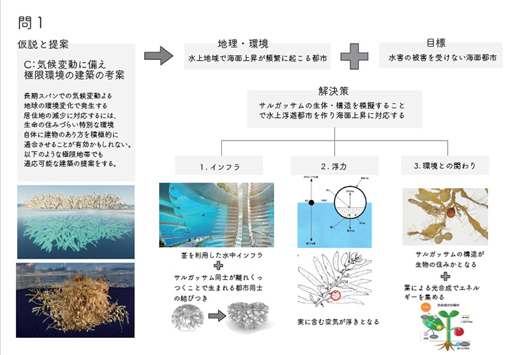 自給自足可能なシステムを搭載することによって、自然破壊や人口集中の解消を目指す雲の形を模した浮遊都市や、サルガッサムの生体・構造を模擬することで海面上昇に対応する水面浮遊都市などが、気候変動の影響により訪れる極限環境に柔軟に対応できる新しい解決策として発表されました。