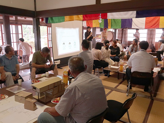 ワークショップでは、住民の方と学生の混成チームで3班に分かれ、事前に学生らが準備した附属屋の1/20模型にその場で手を加えながら、集落にどんなものがあったらいいか議論を膨らませて行きました。最終的には、できあがった模型とシートを提示しながら各班発表を行いました。各班それぞれ、住民の方々からたくさんの意見が出て議論が盛り上がりました。