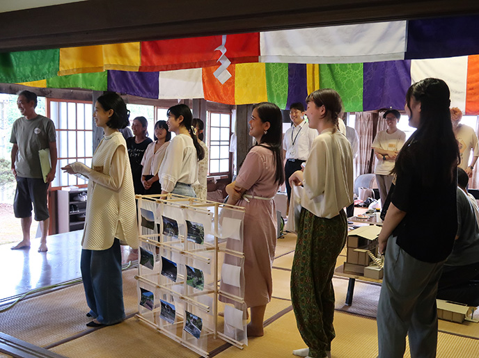 また今まで赤芝集落に訪れた際に学生が撮影した写真の展示を行いました。展示のためのディスプレイは、組み立て式で持ち運びしやすく、繰り返し使えることを意識し学生がデザインしました。写真を掲示するための白い布は、かつて赤芝で栄えた養蚕を意識して制作したものです。