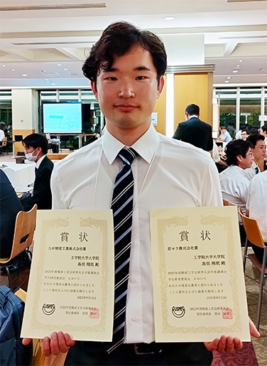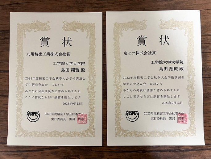 9月13日に福岡工業大学で開催された2023年度精密工学会秋季大会 学生研究発表会において、機械工学専攻1年の島田翔琉さん(マイクロシステム研究室・鈴木健司教授)が「九州精密工業株式会社賞」と「京セラ株式会社賞」の2つの企業賞を受賞しました。