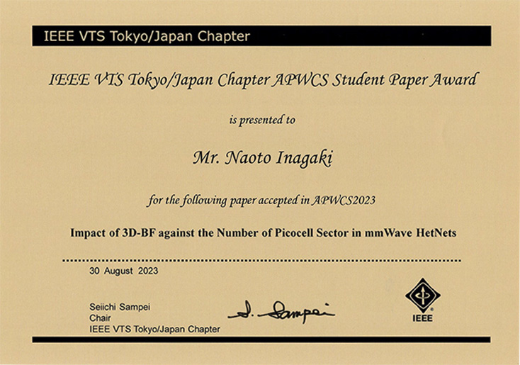 学生論文賞は、日本の大学/大学院に所属している学生が対象で、IEEE VTS Tokyo/Japan Chapterの審査を得て授与されるものです。投稿論文が採録になり発表した13名の中から2名に与えられました。