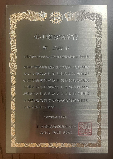 3月17日にオンラインで開催された日本機械学会 関東支部 第29期総会・講演会において、機械工学専攻修士1年(受賞当時)の縣豊樹さん(知的機械材料研究室、柳迫徹郎准教授)が若手優秀講演賞を受賞しました。