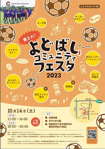 建築学部まちづくり学科 野澤研究室は、10月14日(土)に東京都新宿区西新宿5丁目に位置する淀橋会館とせせらぎ公園にて「よどばしコミュニティフェスタ 2023」に出展します。