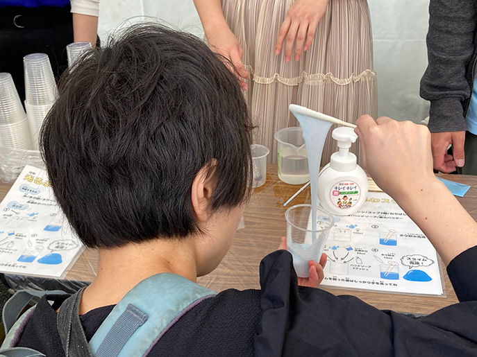 光るふわふわスライムを作るブースを出展しました。普段からイベント出展を重ねているメンバーは、搬入・設営準備をスムーズに進め、一度に3組が体験できる会場を作り上げました。ブースを見かけた子供のほとんどが「やりたい」と歩みを止める人気ぶりで、順番待ちの列ができる時間もありました。「うわぁ、ふわふわ!」「光る様子を家で見よう!」など親子で楽しく会話しながら帰る様子に、メンバー学生は充実感を得ていました。