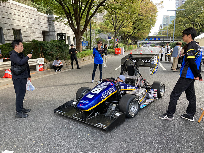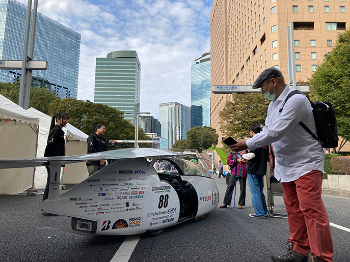9月の大会で、全国4位と健闘したフォーミュラチームは、その大会に参戦した実機を展示しました。ソーラーカーと並んで展示された青い車体に、「どう違うの?」と自然と会話が生まれていました。超高層ビルを背景に、レーシングカーとソーラーカーが並ぶのは珍しく、写真に収める方が多く見られました。学生達は、昨年からチーム力向上を意識することで大会成績を伸ばしてきました。搬出入や見学者の説明でもメンバーの結束を感じる動きが見られ、今後の成長が期待されます。