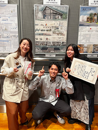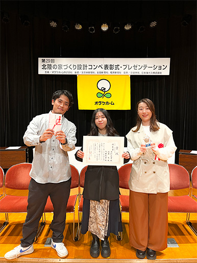 10月28日、第29回北陸の家づくり設計コンペの最終審査会が行われ、建築学部建築デザイン学科の西村美里さん(西森研究室・西森陸雄教授)、佐藤慧さん(冨永研究室・冨永祥子教授)、幅亜加里さん(西森研究室・西森陸雄教授)の作品が優秀賞を受賞しました。