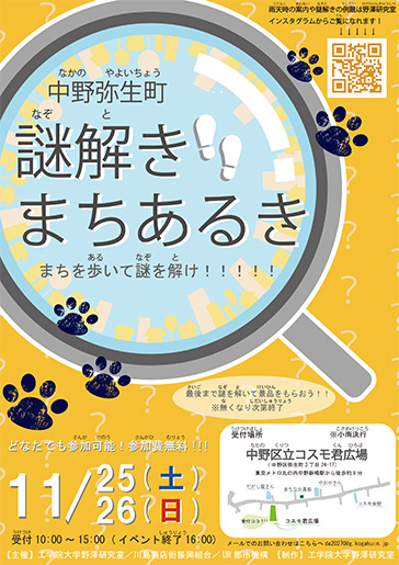建築学部まちづくり学科野澤研究室は、11月25(土)・26(日)に中野区弥生町川島商店街にて「中野弥生町 謎解きまちあるき」を開催いたします。