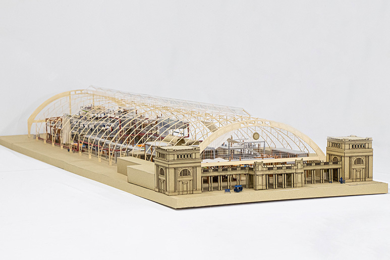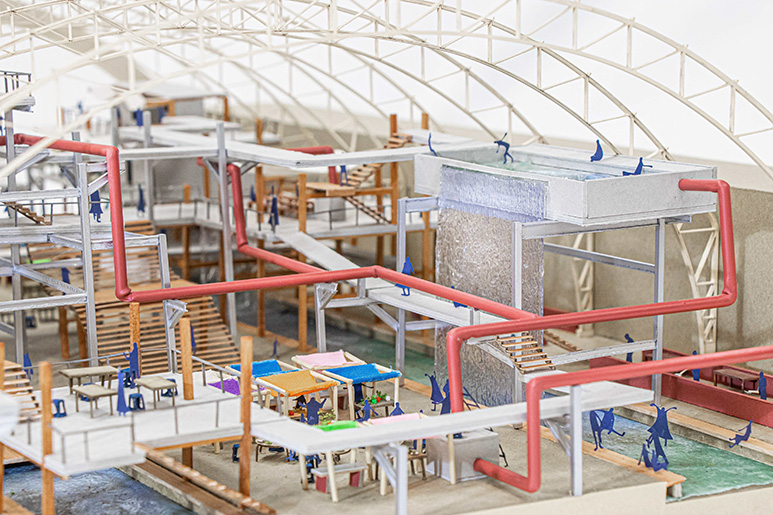東條さんの作品は、1916年に開業したバンコクの中央駅が廃止となることを踏まえた、駅のコンバージョン計画です。ヨーロッパの駅舎とは異なる特徴を有するこの駅が、106年ものあいだ地域住民の生活の場であったことを歴史的空間と捉え、現在の都市が抱えている問題「運河の水質汚濁」を解決する拠点へ再編した提案です。下水処理設備を挿入し、タイ人の寛容な性格を生かした活動と掛け合わせることで、処理設備と住民が共生していく施設を設計しました。