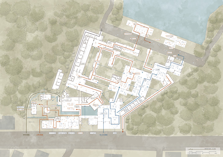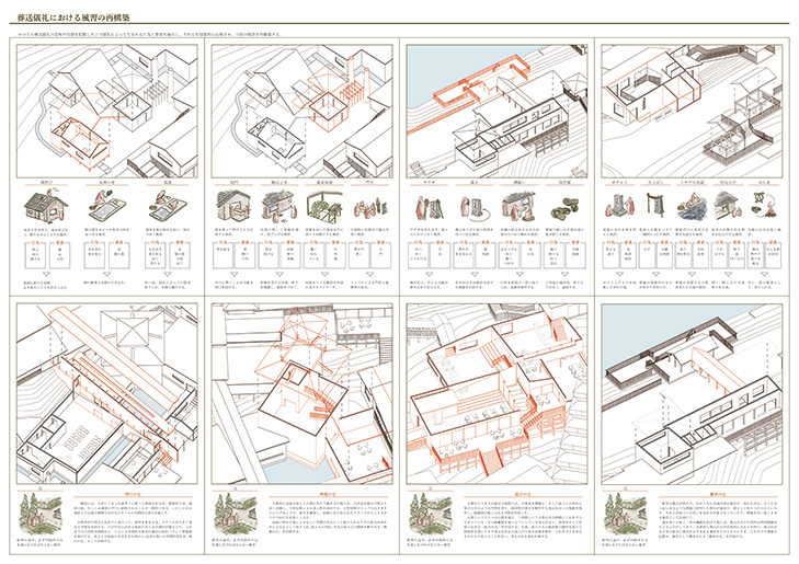橋田さんの修士設計は、現代の定型化された葬祭空間と効率を優先した事務的な葬儀に疑問を呈し、地方における葬祭建築の在り方を模索した作品です。地域に根付く風習と、村人の手によって行われていたかつての葬儀を詳細にリサーチし、生から死への一連の葬祭の流れを包括したプログラムと、かつての葬送儀礼が持つ意味や役割・それに伴う行為を再翻訳した建築空間を計画しました。