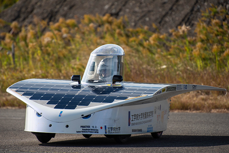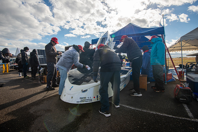 19日日曜日はレース2日目、最終日です。風は依然強いとはいえ前日より弱まりました。昨日レースの流れをつかんだ生徒たちは、朝早くから、自ら必要なことを見つけ活動していました。前日にパンクした疑いのあるタイヤを交換する生徒、データ受信とドライバーとの無線の再確認をするエネルギーマネジメント班、世界大会でドライバーを務めた大学生から運転指導を受けるドライバー。整備が終わると、少しでもバッテリに充電しようと太陽電池による発電に取り掛かるなど、チームが一丸となって確実に準備を進めます。レース開始直後は、太陽が出たり雲に隠れたりの天候で、エネルギーマネジメント班は雲の厚さと流れている方向を観察して、その都度ドライバーに速度を指示する姿が見られました。効率よくバッテリを持たせ、かつ順位を上げるための作戦です。大会の安全な進行のために全チームに対して走行速度が規制される時間も的確に対応し、自動車部は大きなトラブルなく制限時間いっぱいまで駆け抜けました。