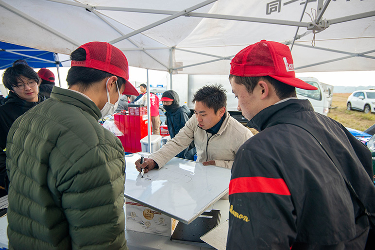 ドライバーの3人はいずれも初挑戦なので、レース初日は40分ずつの運転です。ドライバー交代時の停車、ピット内誘導といった一連の動作はスムーズで、学内練習の成果が発揮されました。ピットからコース内に入る際に1回ミスがありましたが、2回目を犯さずレースを進めることができました。