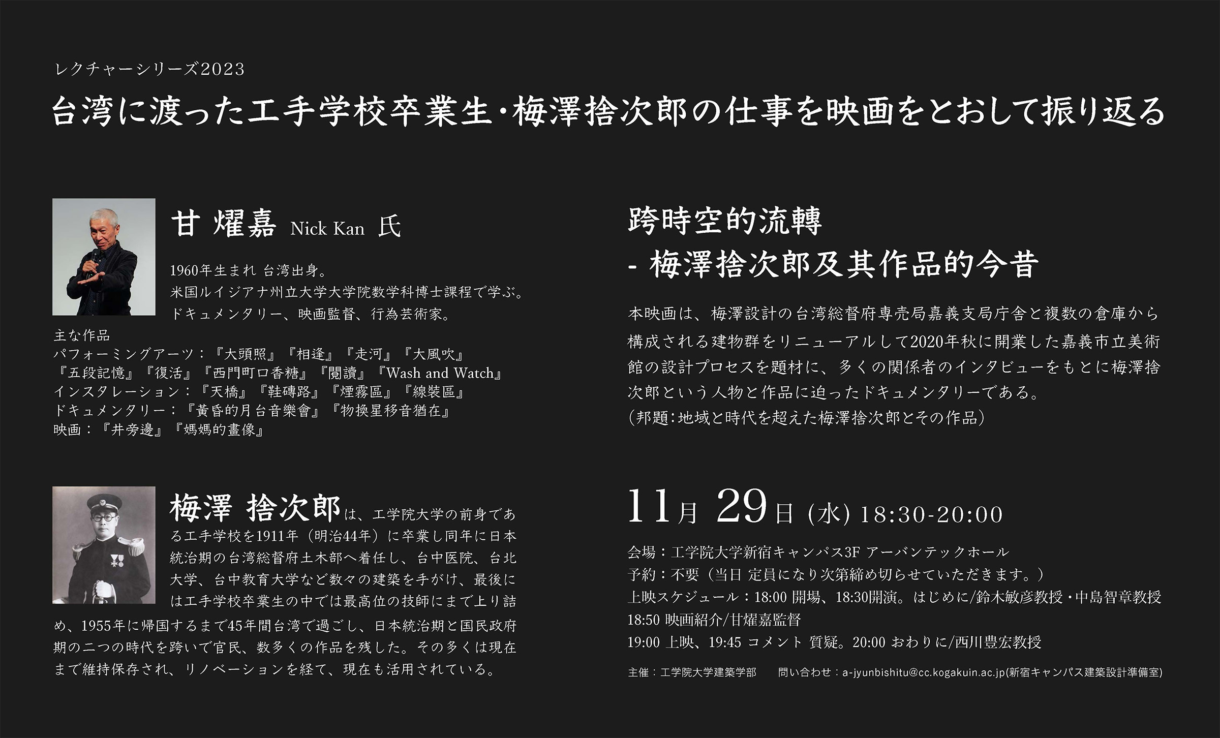 11月29日、新宿キャンパスにて建築学部レクチャーシリーズ2023が開催され、工手學校(工学院大学の前身)の卒業生で、台湾で活躍した建築技師、梅澤捨次郎の映画上映会が行われました。
