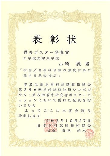 2023年10月27日に開催された日本材料試験技術協会主催の第296回材料試験技術シンポジウムにおける若手研究者ポスター講演会において、機械工学専攻 修士2年の山崎練さん、同専攻修士1年の山田啓聖さん(以上材料力学研究室・立野 昌義教授)が優秀ポスター発表賞を受賞しました。