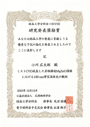 電気・電子工学専攻博士後期課程1年の小川広太郎さん(固体物性研究室・尾沼猛儀教授)による研究論文はふたつの研究会で受賞しました。