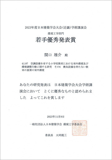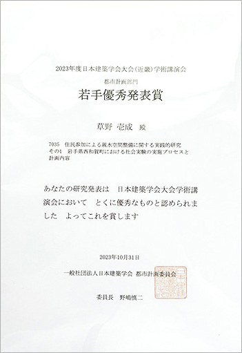 この度は2023年度日本建築学会大会(近畿)学術講演会にて若手優秀発表賞を賜り、誠にありがとうございます。